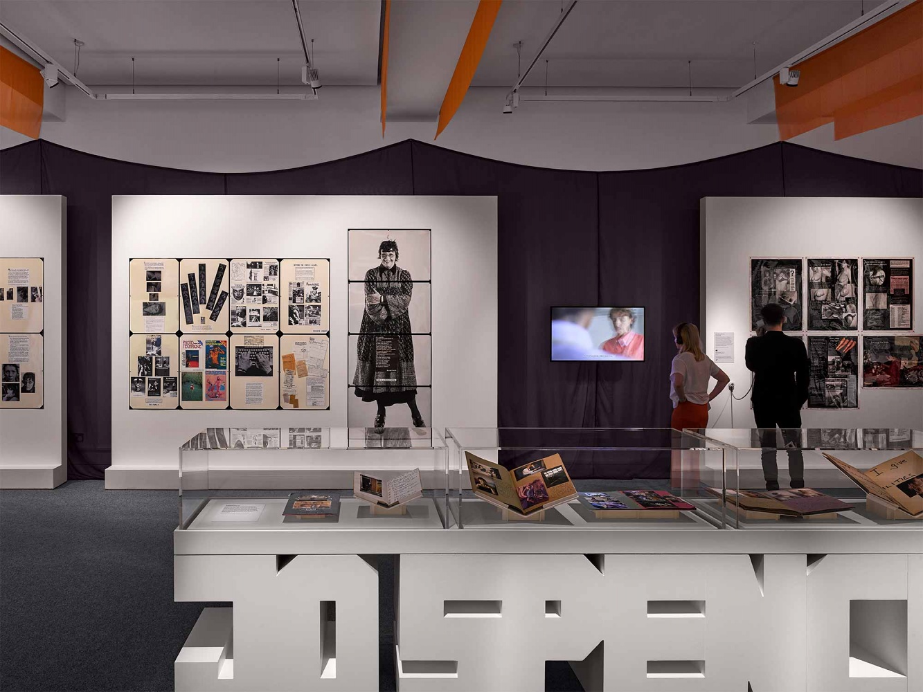 David Kohn Architects’s exhibition design begins by addressing the often clinical environment of white cube gallery spaces. The walls of the Wellcome gallery are draped in coloured and tie-dyed fabrics to create a more provisional and intimate interior. The experience of the exhibition is intended to disrupt visitors’ expectations of art exhibitions and offer a welcoming and comfortable setting for the display of what is at times challenging work.