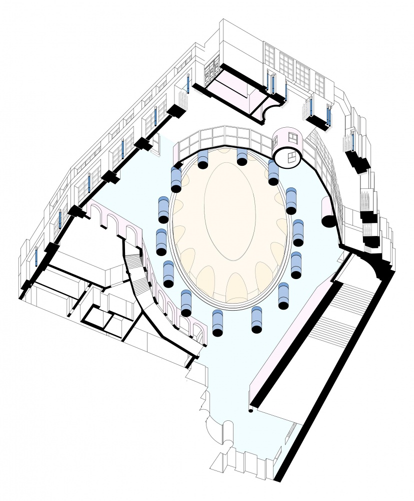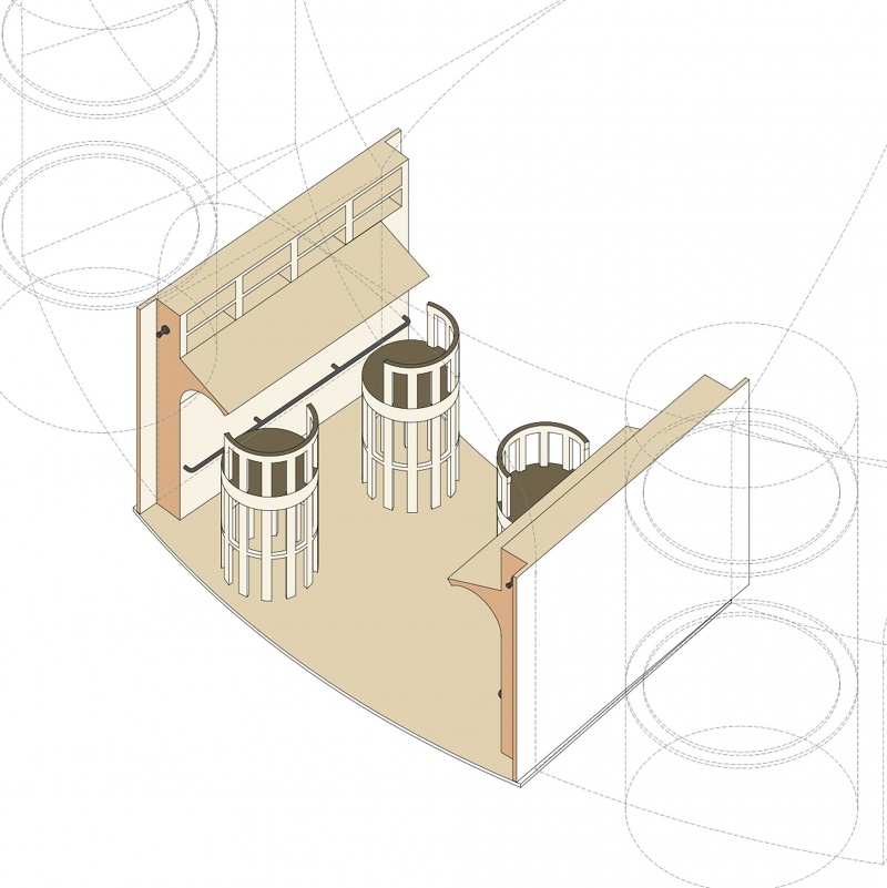 Isometric view of seating booth overlooking oval hall