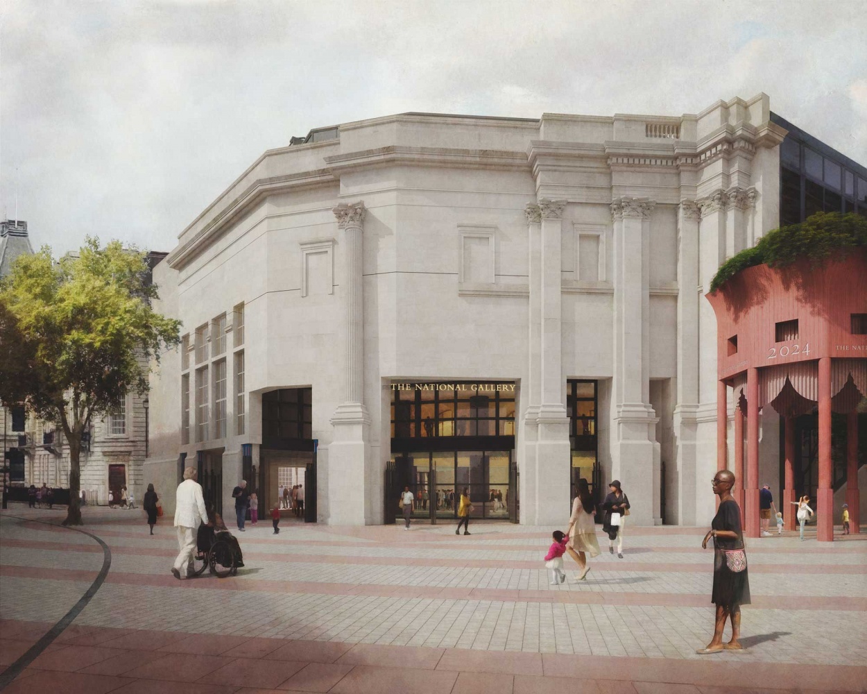 The public realm strategy proposed a significant greening of the northern terrace of Trafalgar Square and Jubilee Walk. New paving centred on the oval hall was inspired by Michelangelo's Campidoglio in Rome while the architecture of the interior,  temporary pavilions and booths were similarly inspired by paintings in the collection.