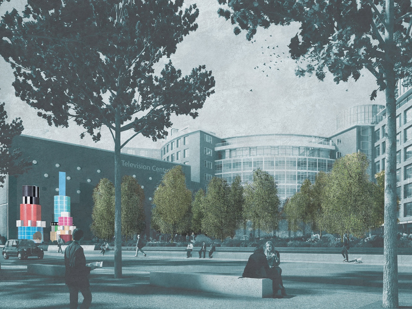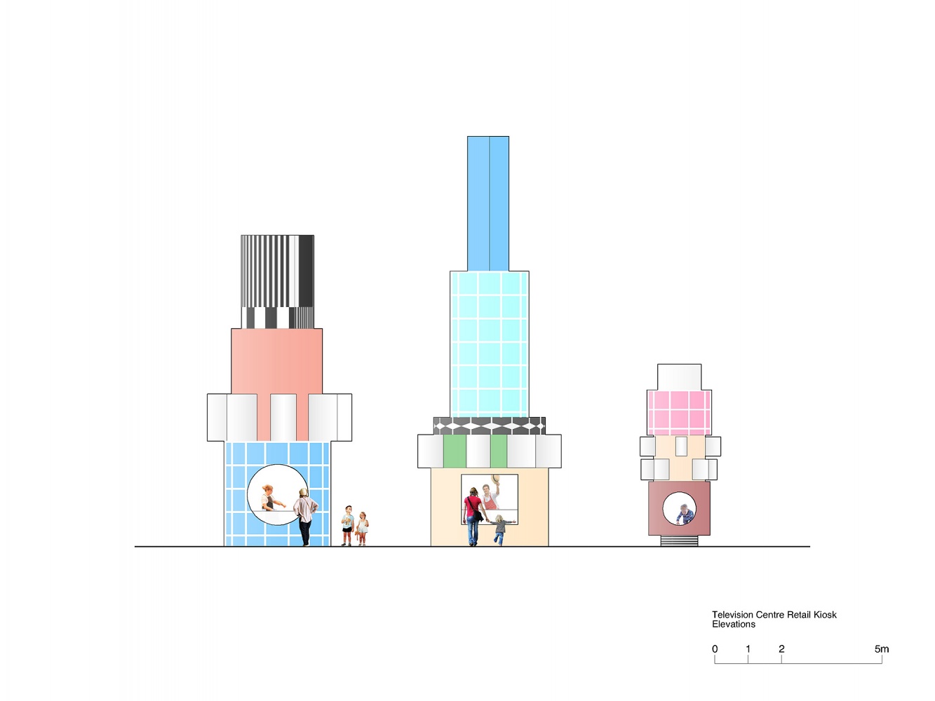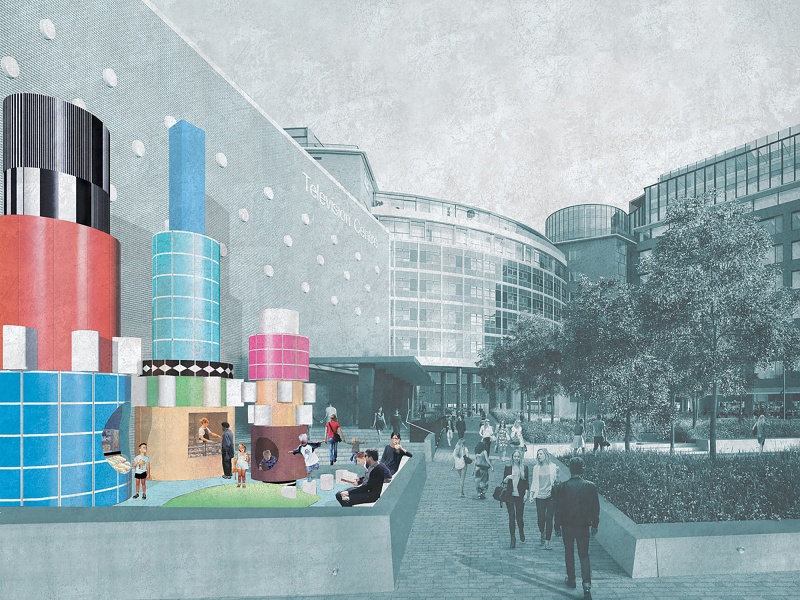 David Kohn Architects proposed a family of three totem-like structures that stand at the entrance to Television Centre. Their playful form and pattern references the BBC’s Testcard F, an iconic image designed to calibrate television sets that aired from 1967 to 1999, as well as the geometries of the iconic BBC building. The structures house a coffee kiosk, ice cream stall and play structure, inviting children to this corner of the site and symbolising TV Centre’s transformation from exclusively a place of work to a residential community. The competition was organised by Stanhope in collaboration with AHMM Architects.