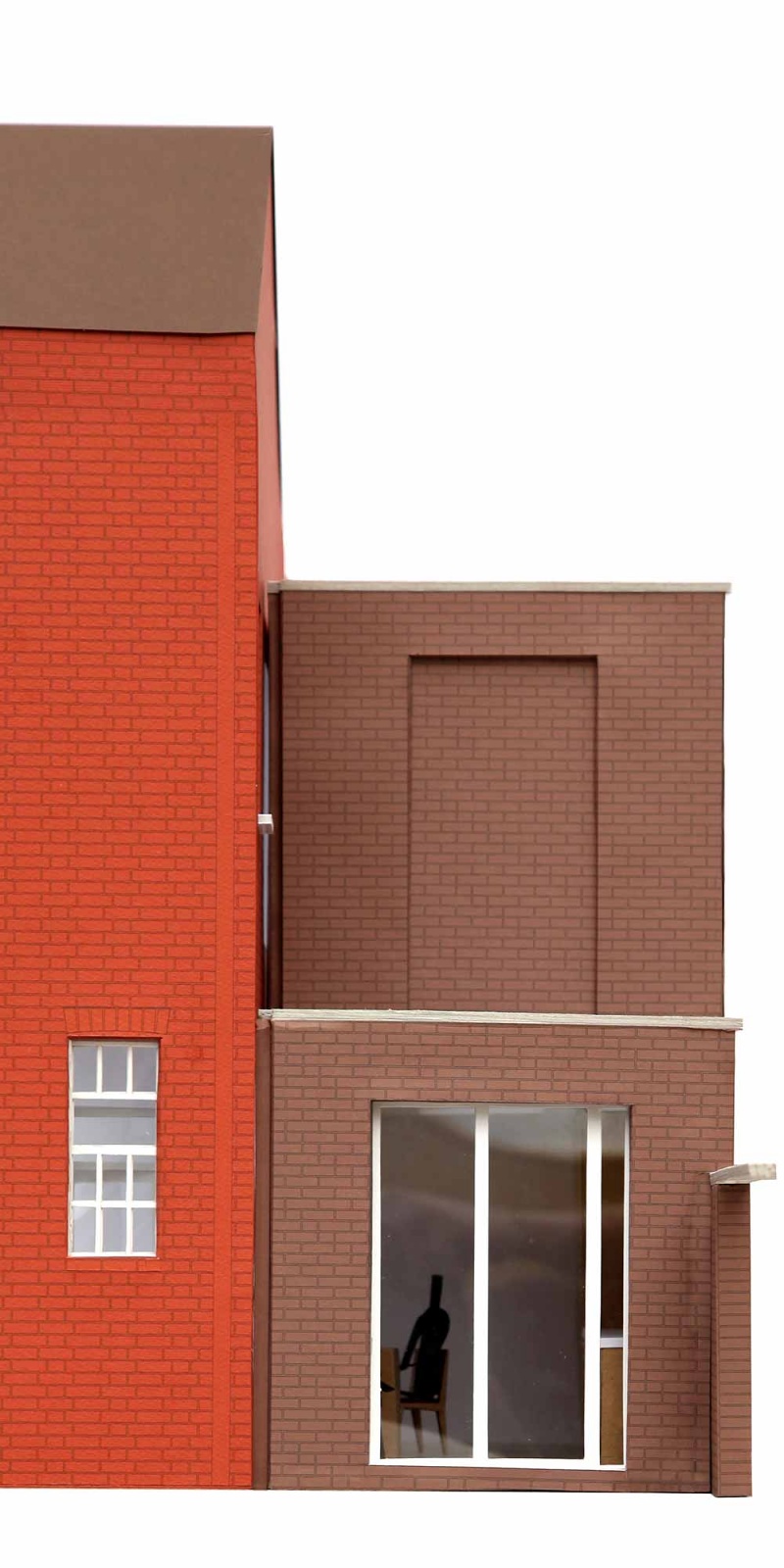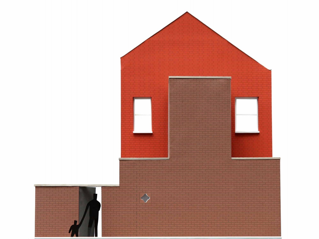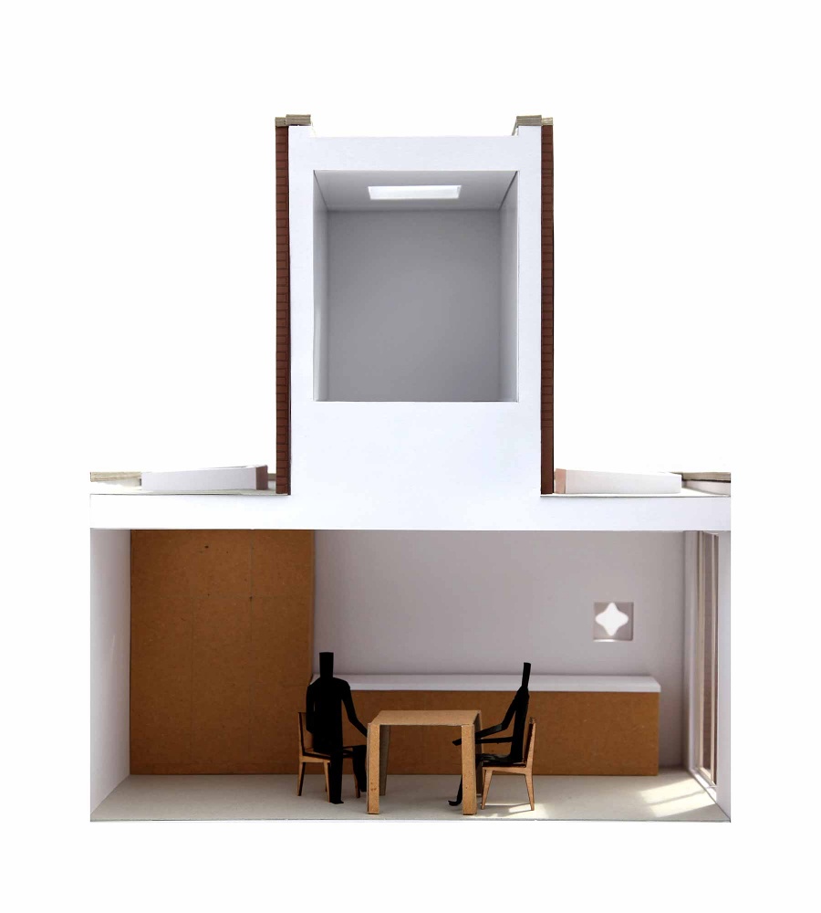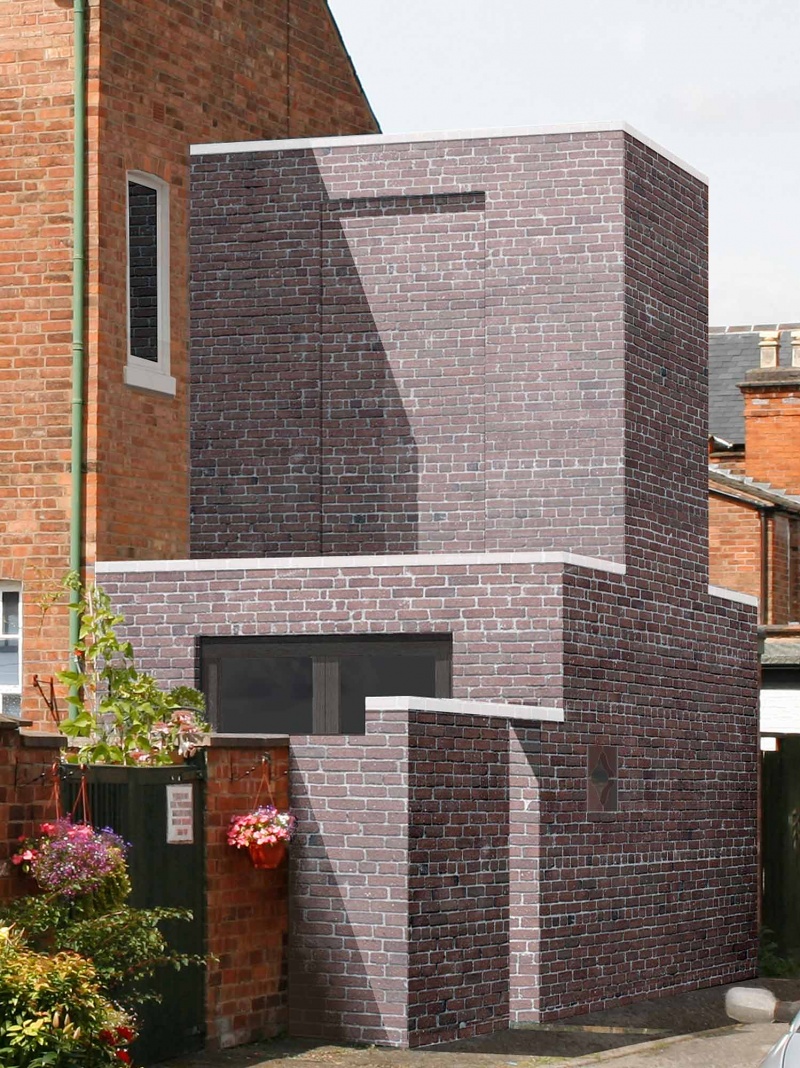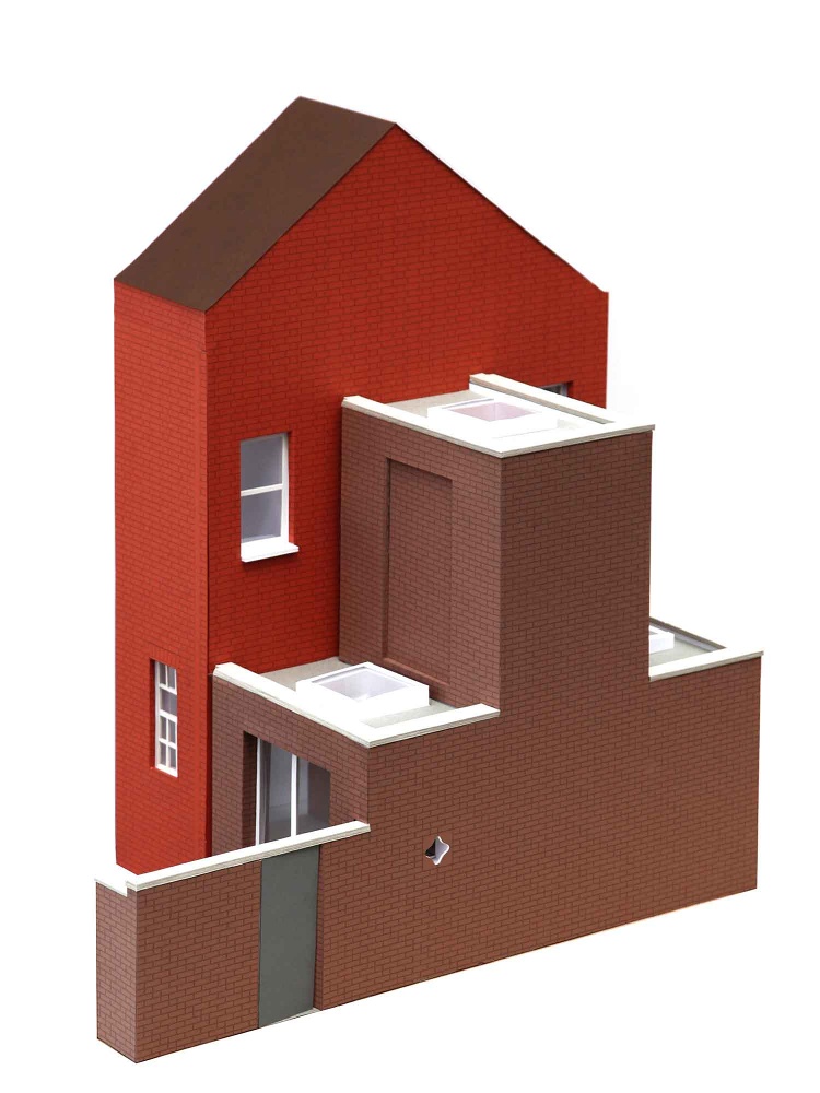 The rear of the house faces onto a backstreet that was once the barracks parade ground. Our proposal reinstates the back elevation as a face to the building to create what the architect Peter Smithson termed a Janus building. The proportions of the rear extension are reminiscent of the Georgian public facades of the nearby town centre. An amoeba-shaped window lightens the formality of the elevation and provides a view from the new kitchen to the back street and local playground beyond.