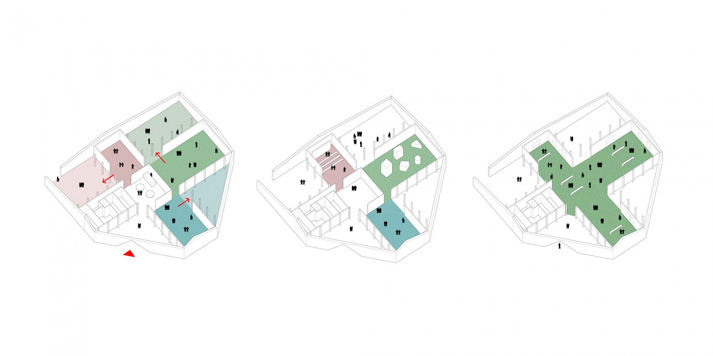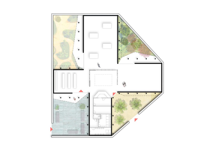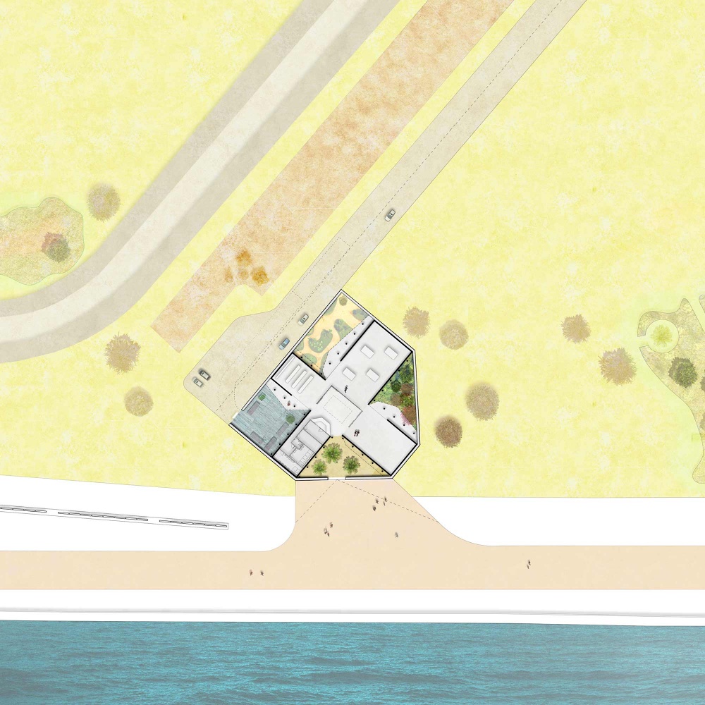 The fort-like form of the proposal is a response to the building’s relative isolation and water’s edge location. The perimeter wall is heavy in-situ concrete, planted with succulents. A distinctive triangular entrance, that can be seen across the bay, delivers visitors into the cooler garden courtyards and finally into the refined white interiors of the galleries. A full spectrum of raw nature to abstract idealised space is offered to artists and curators to work with.