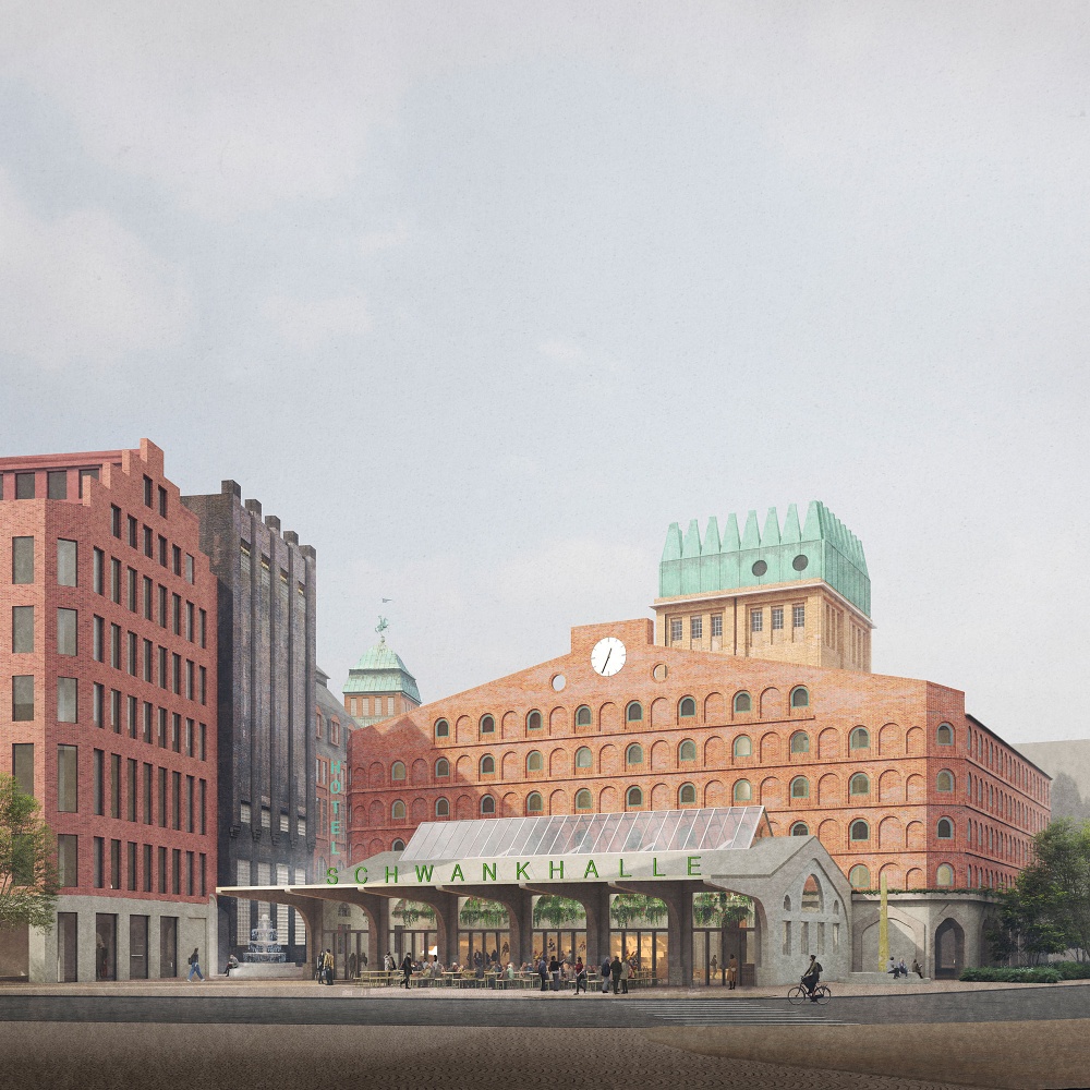 Our proposal 'Altona Gateway' acknowledged the role of the site as the welcome to a new residential district that will occupy the former Holsten Brewery. The scheme is an ensemble of new and old buildings that includes: a new-build 170 room hotel; a restaurant for 80 covers in the refurbished brewery distribution hall; 65 student rooms in a refurbished historic tower; and a new-build office building alongside associated landscaping.