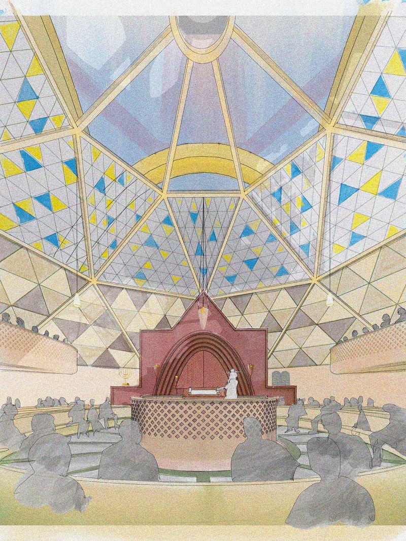 The new programme is in a single building that aligns with the university to the east, completes the square to the west whilst embracing the orthodox synagogue in a curving gesture to the south. Orthodox and reform synagogue entrances are aligned and create a double head to the new complex. The dome of the orthodox synagogue and the silhouettes of the reform synagogue’s prayer room and youth centre towers are arranged in a picturesque manner to both give legibility to the urban space and to create welcoming gateways from both the east and west. A large arched passage, reminiscent of the Chilehaus, brings south light into the centre of the site and frames a view of the synagogue dome.