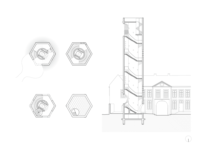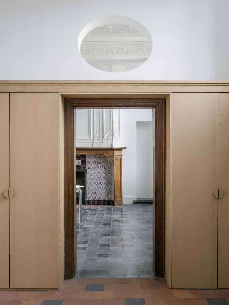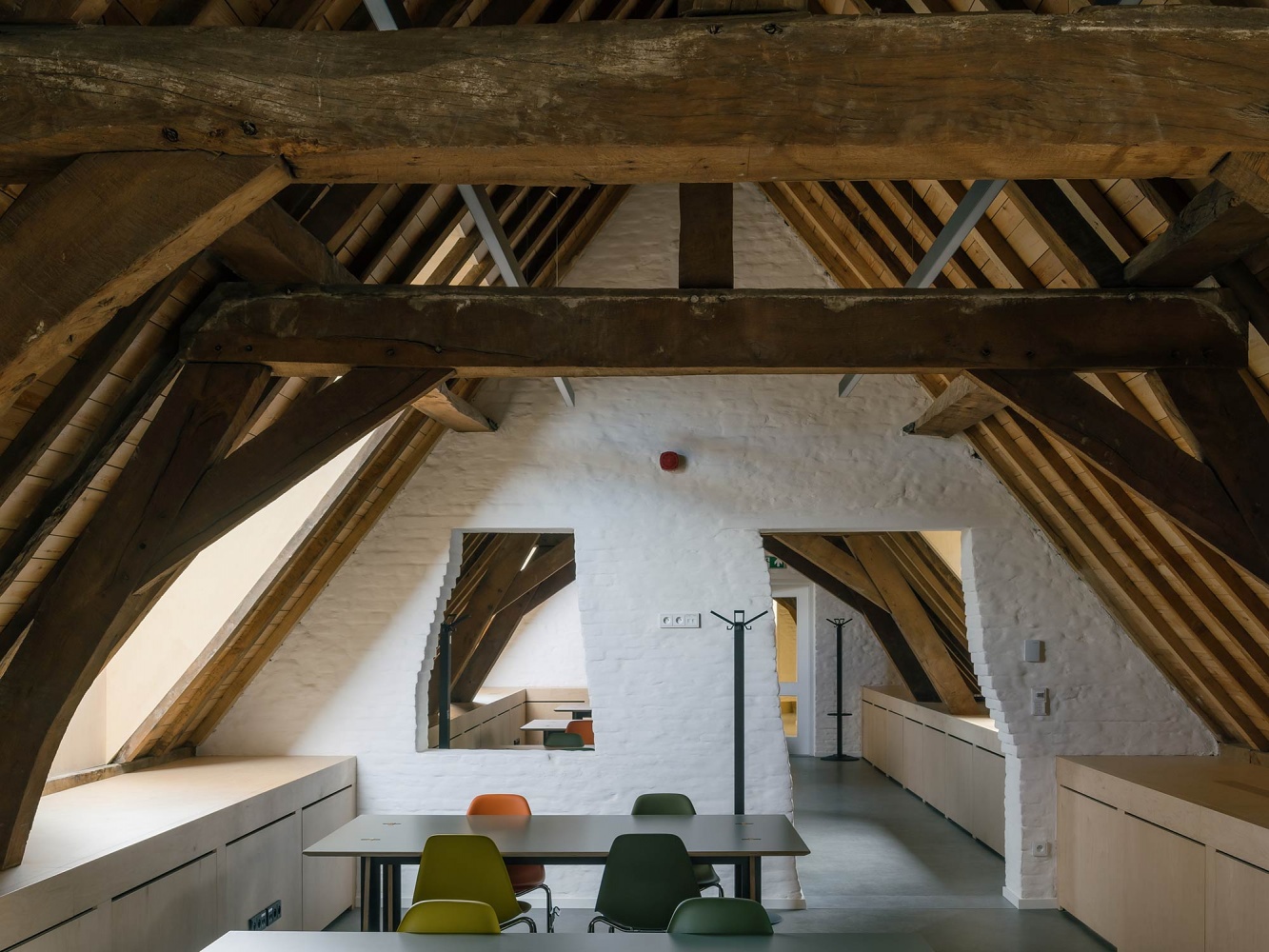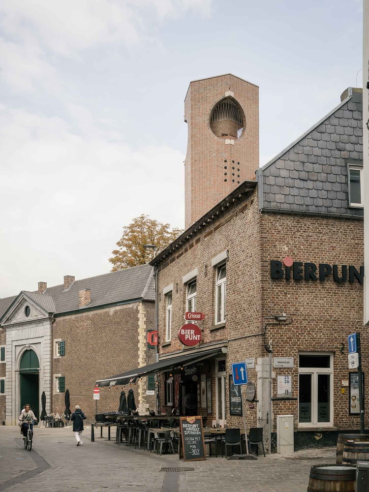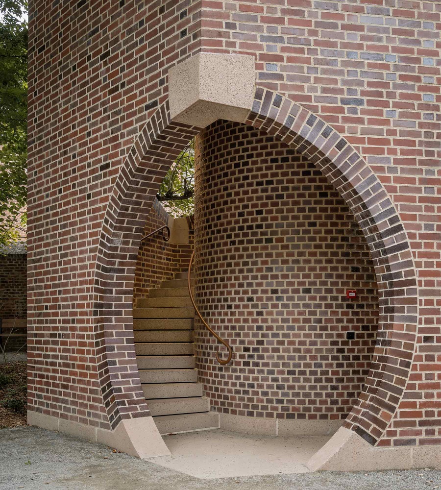 A striking new 30-metre belvedere tower re-establishes the beguinage’s presence on Hasselt’s skyline, acting as both landmark and viewing point. The refurbishment of the terraced houses balances restoration with subtle innovation: fireplaces become doorways, attics convert into ateliers, and oak-framed interiors blend old and new. These spaces now host master’s studios, research areas, exhibitions, and living quarters for doctoral candidates, while the gatehouse contains an auditorium and a small museum.