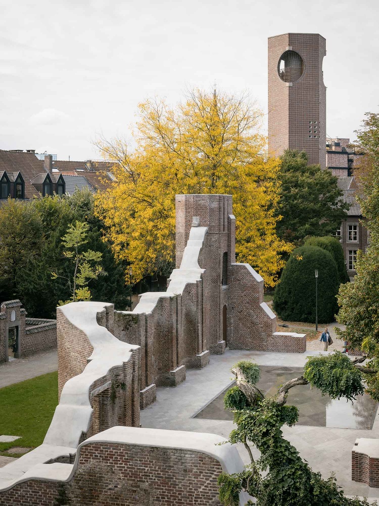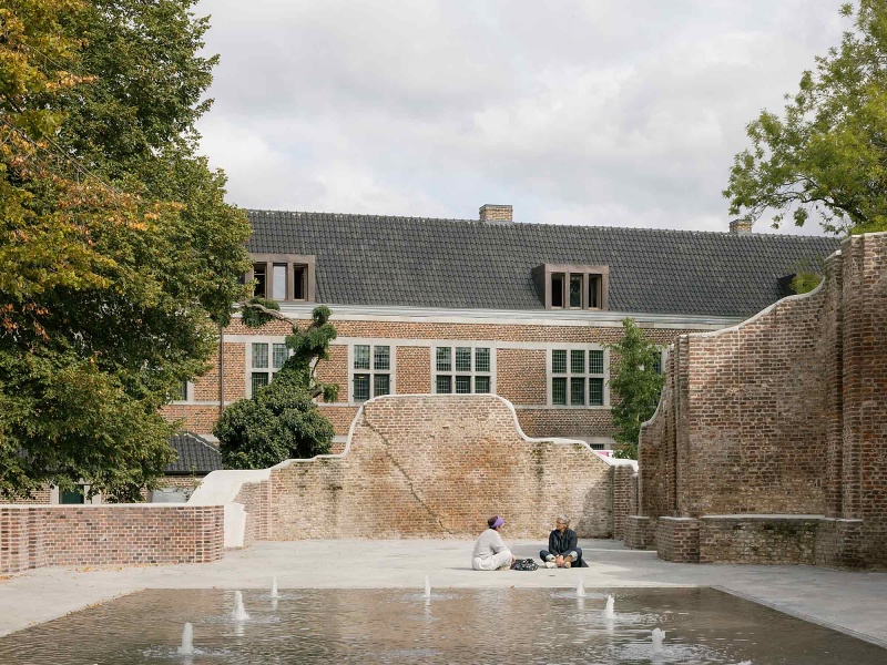 The project, initiated through a 2018 international competition by Team Vlaams Bouwmeester, preserves the beguinage’s historical character while increasing its permeability to the city. A new circular entrance and interconnected garden routes invite the public into what was once a secluded space. The footprint of the ruined church has been transformed into a reflecting pool that can also serve as a stage, symbolizing renewal and adaptability.