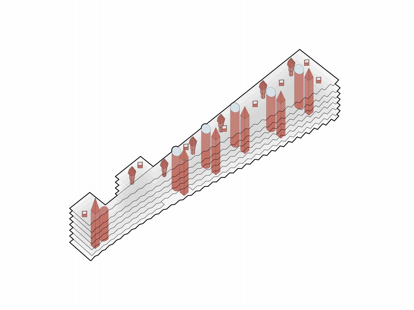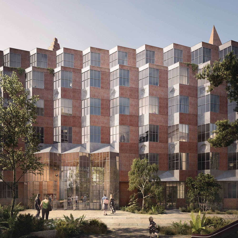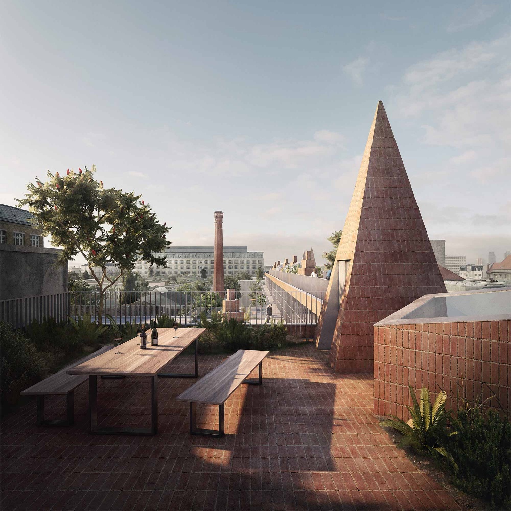Our design draws on the site’s historic context, garden location and links between German and British architecture culture. Herman Muthesius’ 1905 ‘Das Englische Haus’ remains one of the finest accounts of the particularities of British homes, such as an interest in the diminutive architecture of bays, inglenooks and a concern for a building’s silhouette. With specific reference to Burghley House, an example of what John Summerson described as ‘Prodigy Houses,’ the scheme includes an open fireplace in every apartment, bay windows that address the site entrance, and access to a shared picturesque rooftop garden of terracotta chimneys and lanterns.