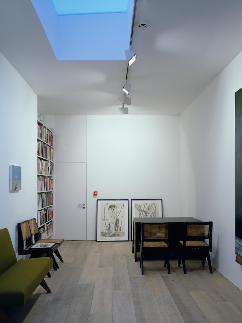 Whilst the galleries are firmly in the tradition of the “white cube”, the client’s characteristic informality steered the design. The office space is within the gallery, removing the familiar separation of the public and private sides of the art business; oak floors and off white wall linings ensure that the white hanging walls are framed within an interior architecture concerned with comfort as well as appearances.