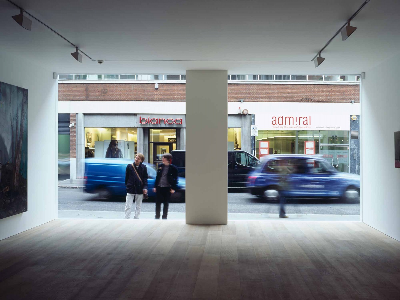 Stuart Shave Modern Art occupies the ground floor and basement of a modest 1950’s office building. The design approach was to exploit the positive attributes of the existing building and urban context to the gallery’s advantage. Grey engineering brick piers in the new shopfront create a precise and suitably proportioned base to the brick clad structure above while the optically clear flush glazing accentuates the first gallery’s connection to the street. The layout of the interior is more like a house than a showroom, with a deep entrance loggia, lobby and changes of direction at the entrance to each room, that heighten the gradual sense of calm and remove from the street.