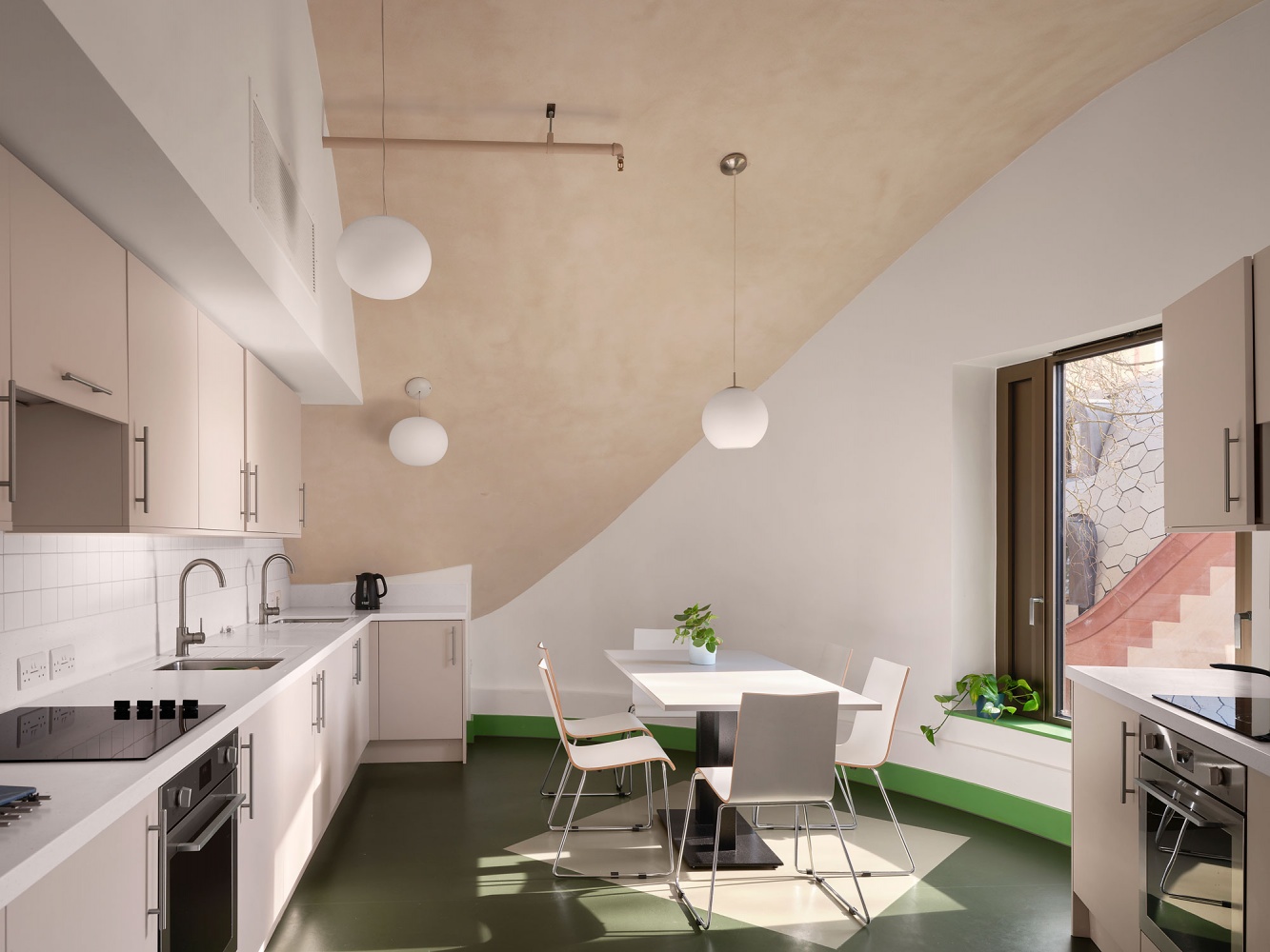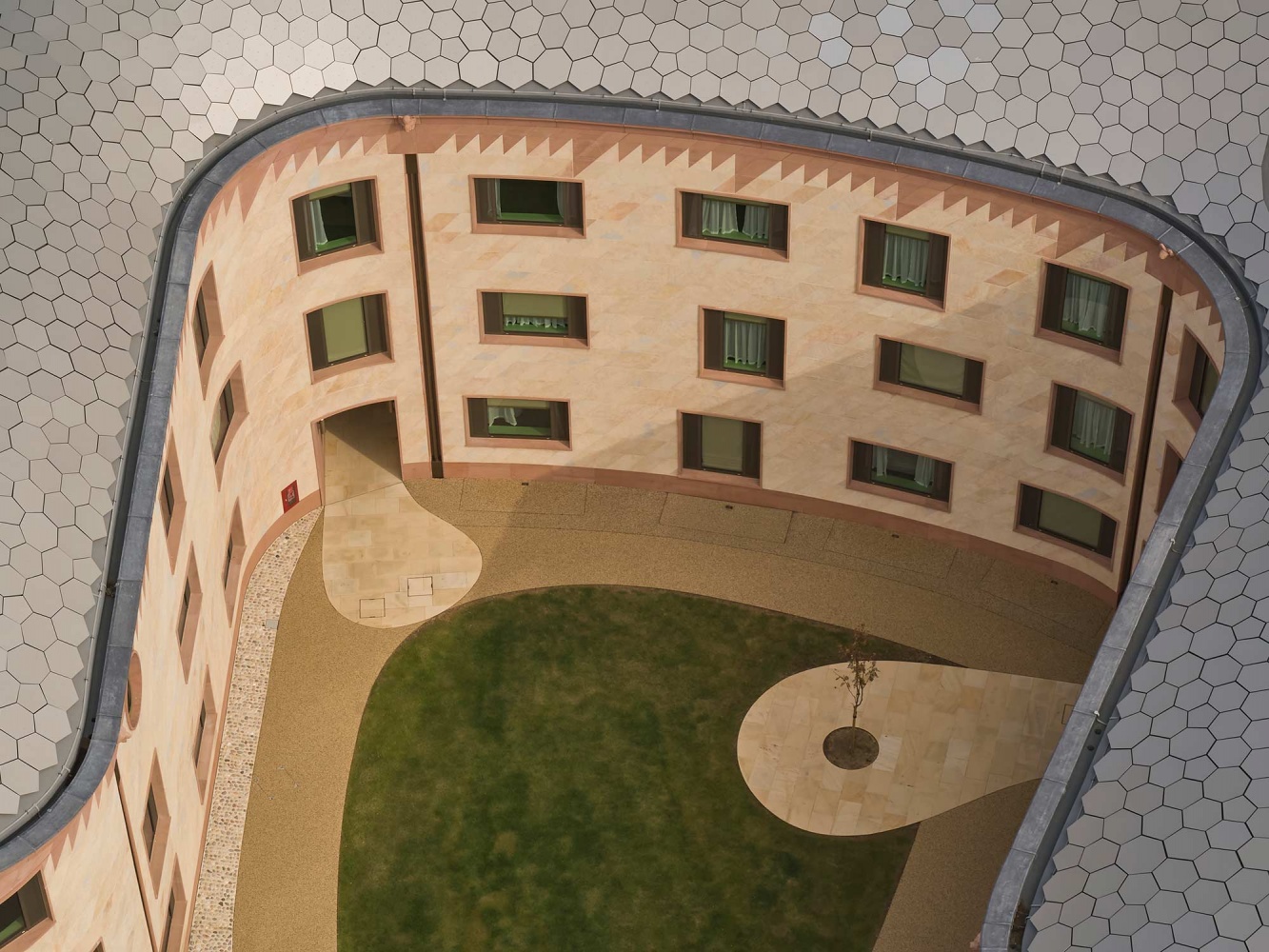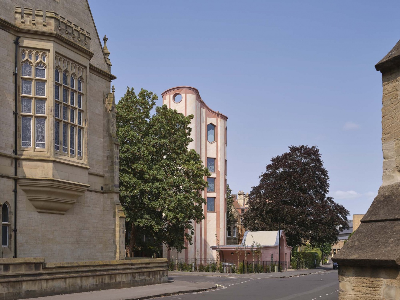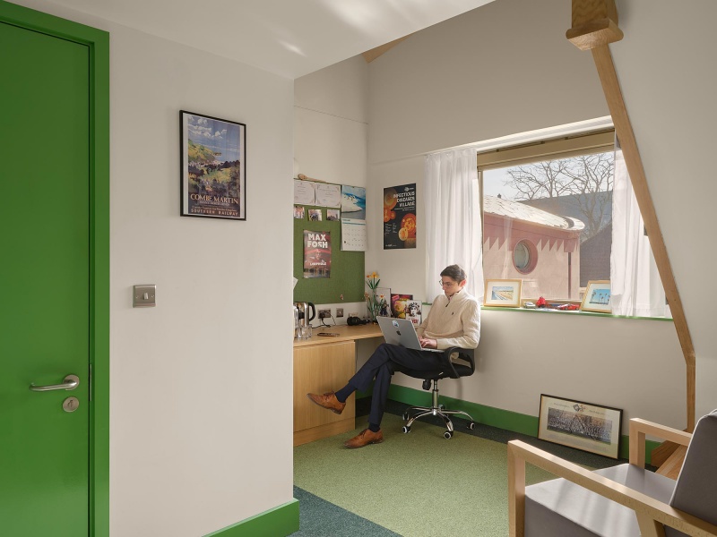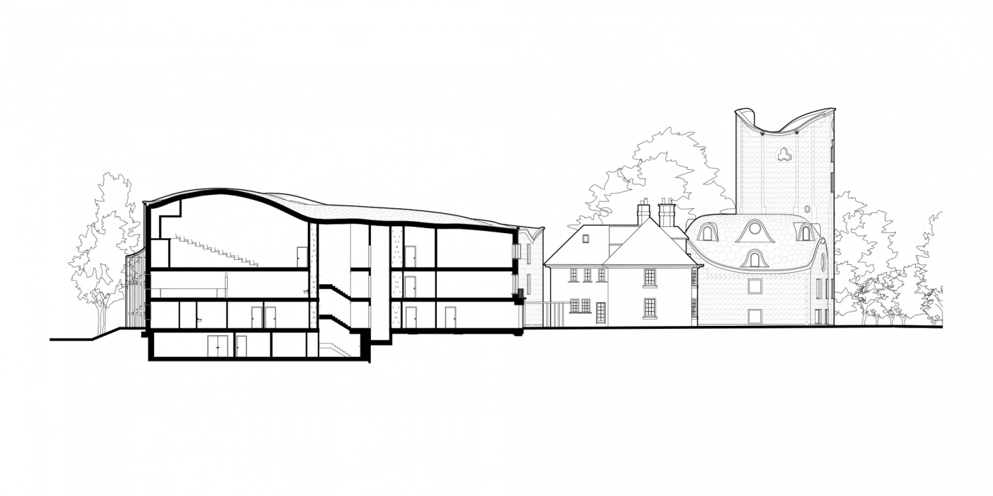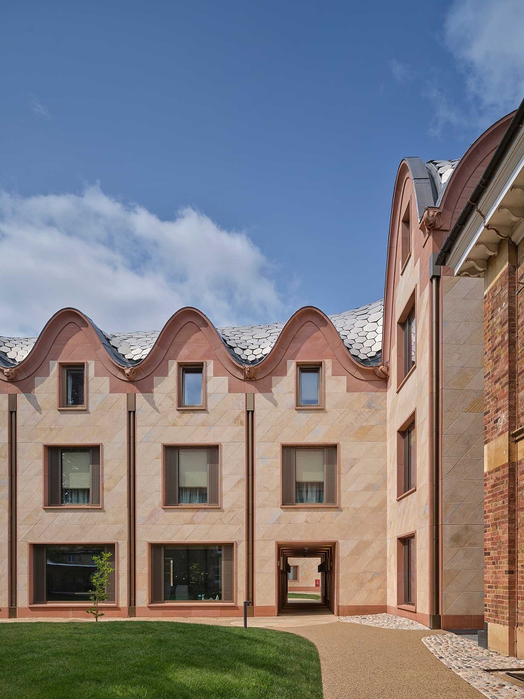 Alongside new 94 new student rooms, the project includes shared kitchens, a music hall, and dedicated student study space. New facilities for the adjacent New College School, a boys’ preparatory school, adjoin the main building. A tower, housing a new charitable institute, and gatehouse complete the composition.