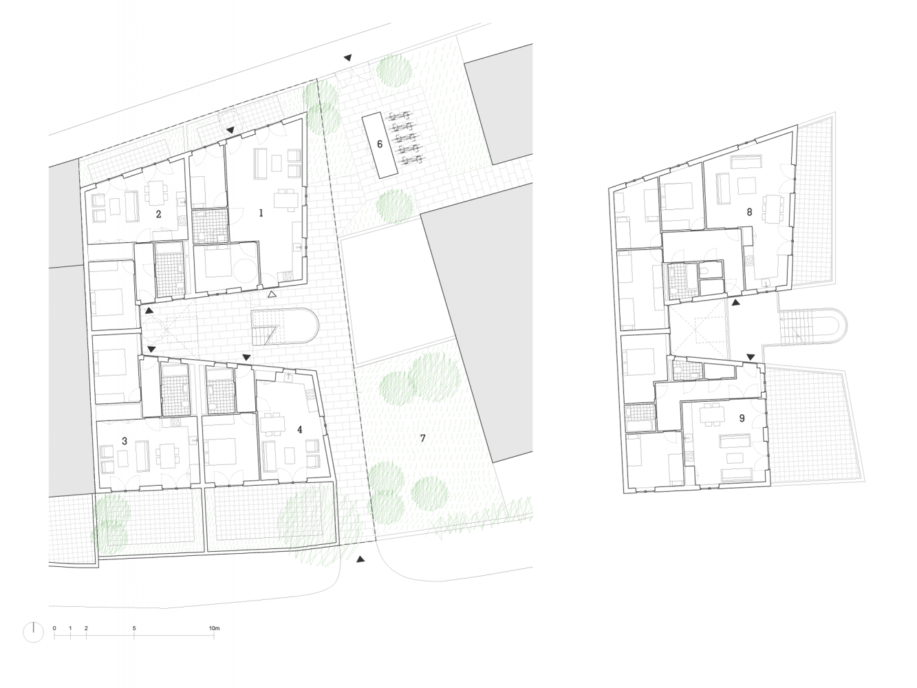 Each home has excellent daylight, generous outdoor private space and shares a communal light-filled atrium decorated with light-reflecting mosaic tiles based on a new collaboration with artist Caragh Thuring.