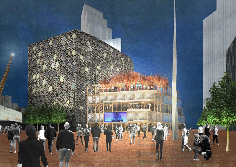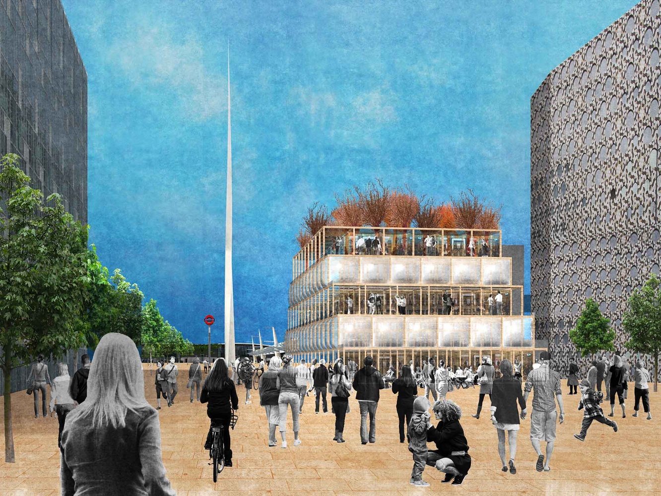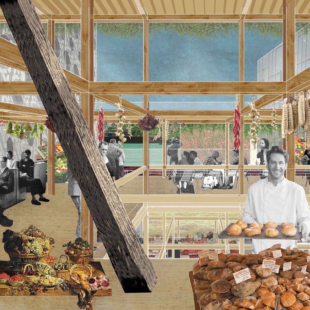 David Kohn Architects won an invited competition to design a new retail pavilion in Peninsula Square, North Greenwich. The proposal was for an innovative timber framed market hall with a marshland rooftop garden.