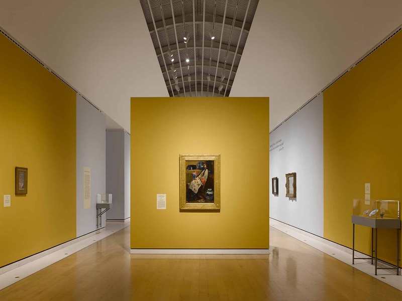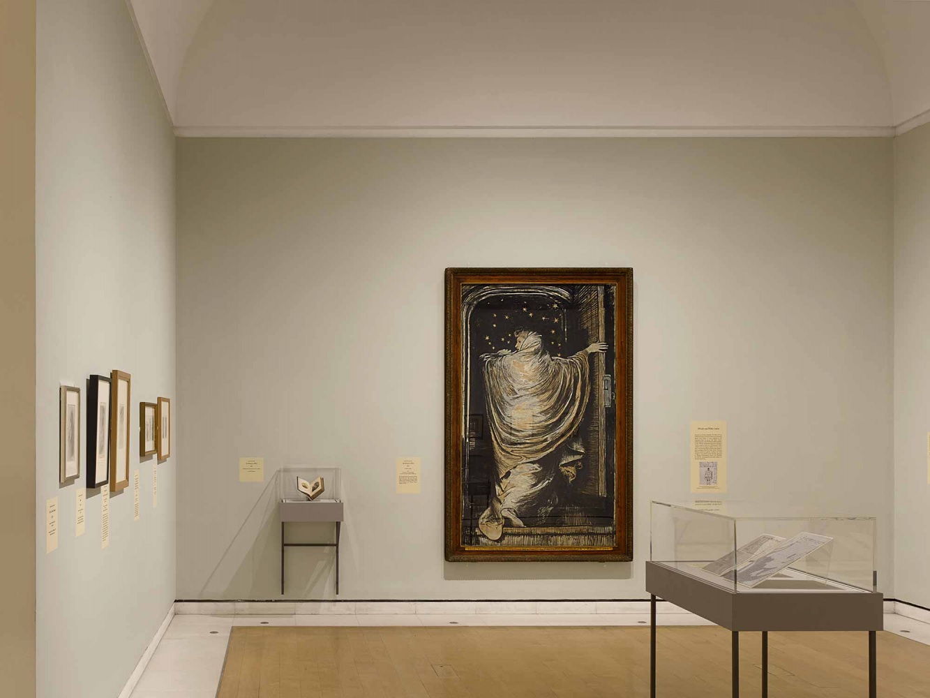 The design of the exhibition divides the sequence of galleries into clearly defined rooms, highlighting specific themes within the extensive body of work. The careful placement of partitions achieves this division within the galleries, while varying colours and tones are employed to create an accommodating atmosphere for the delicacy of the work on display. Bespoke display cases are arranged within the galleries, their furniture-like appearance alluding to a sense of domesticity that rhymes with the setting of many of Whistler’s works.
