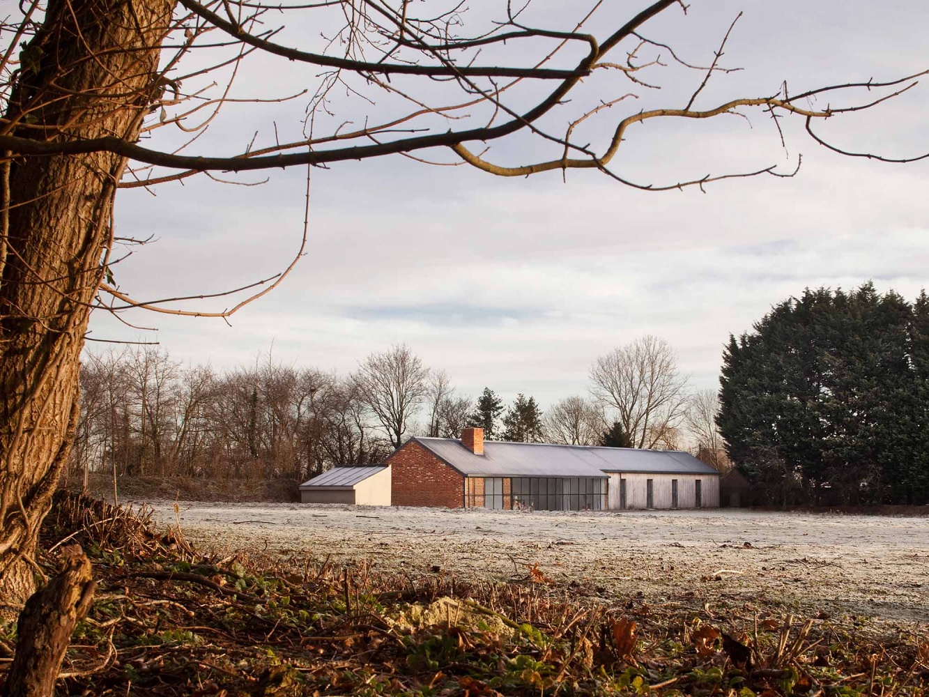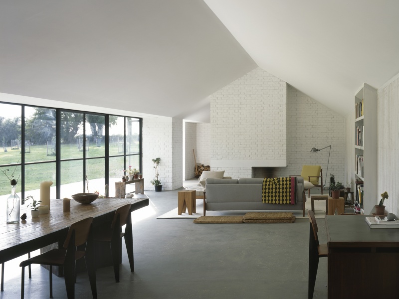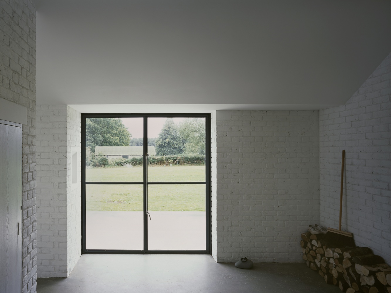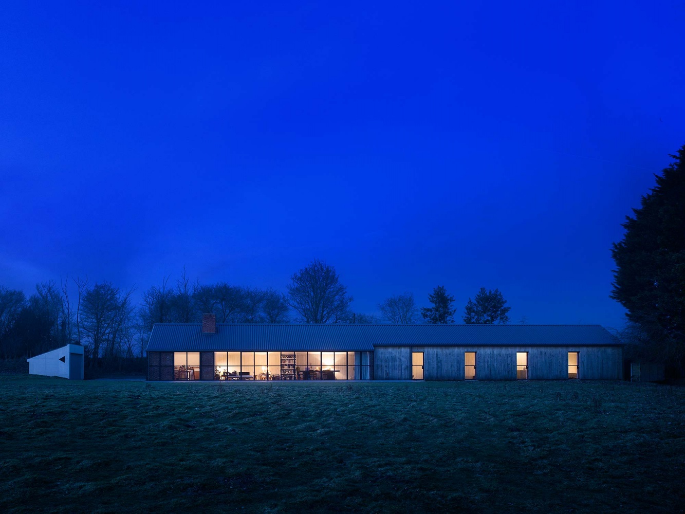 Built on the footprint of a nineteenth century stable block, the building retains its long narrow plan and is divided equally into living and sleeping quarters, each room in the house opening directly onto the south-facing garden and views across the landscape.