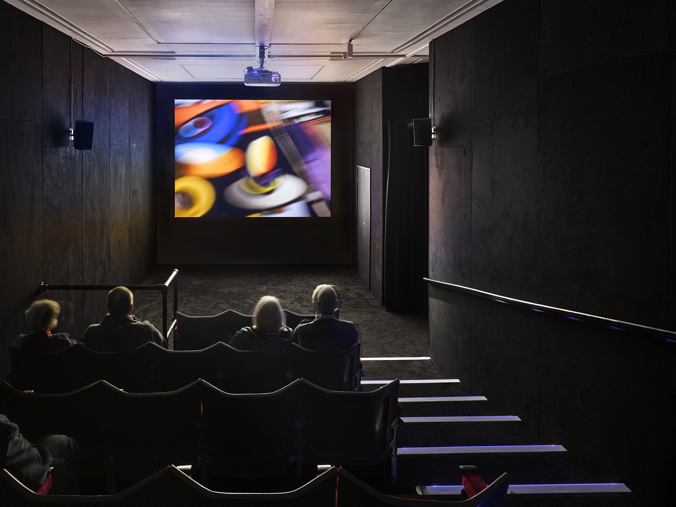 David Kohn Architect’s design work ranged from entirely new spaces to individual pieces of furniture with the overall ambition of creating a coherent and engaging exhibition experience. The installation of several works needed technical solutions such as Buttner’s Fabric Wall (high visibility yellow), 2017 that was required to fit perfectly within the width of one of the 1920’s galleries. In each case, defining the relationship of the artwork to the varied architecture of the building was critical. The eventual placement, form, and material of each setting was specific to these varied conditions. For the Central Court, a console with Neoclassical overtones was designed to allow visitors to sit and watch the films in comfort. The most involved piece of design was the creation of two screening rooms to present Nashashibi’s films Electrical Gaza, 2015 and Vivian’s Garden, 2017. Installed in one of the two 1990’s octagonal rooms, the acoustically isolated spaces create a small building within the gallery as though arriving at a cinema in a public space. The intervention gave the artist the opportunity shape the reception of the films in a new way.