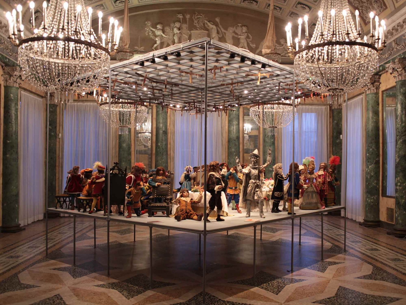 The curatorial approach was therefore to select key pieces within the Museum's collection relevant to the theme of conviviality and compliment them with contemporary art works and installations. Our design approach was correspondingly to reinforce the domestic character of the Villa's rooms by presenting the new installations in the manner of furnishings. A system of signs, screens, tables, plinths, and small interiors were created using an off-the-shelf small-scale scaffolding system produced in Milan by Fratelli Marinelli. David Kohn Architects also collaborated with Milanese fashion designer Colomba Leddi on the design of printed silk installations and carpets and with graphic designer James Goggin on the signage system.