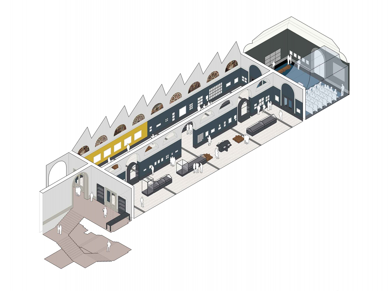 Historic connections between architecture and photography are referenced by the ‘dark tent’: a multimedia projection and lecture space inspired by the travelling darkrooms of photography pioneers of the 19th century. A series of bespoke modular display cabinets has been designed as a miniature house in its own right, and the cabinets together can be easily reconfigured to permit greater flexibility and varied displays. Matching wall cabinets and gallery seating ensure the coherence of the overall design.
