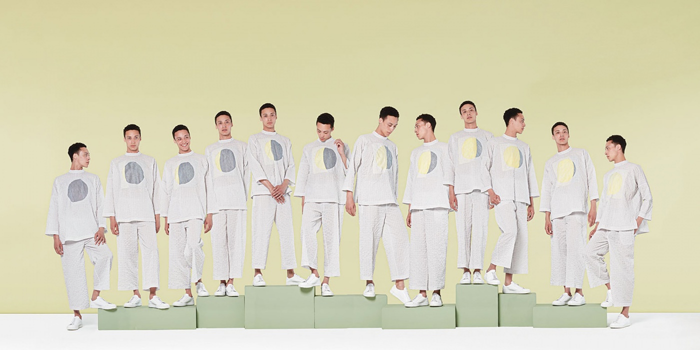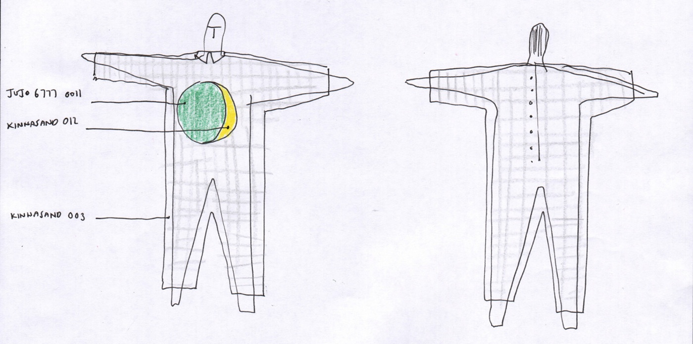 'Calendar Overalls' take inspiration from C17th Calendar Houses: The 12 uniforms represent the phases of the moon, are cut from 52 metres of cloth, assembled with 365 stitches and closed with 7 buttons.
